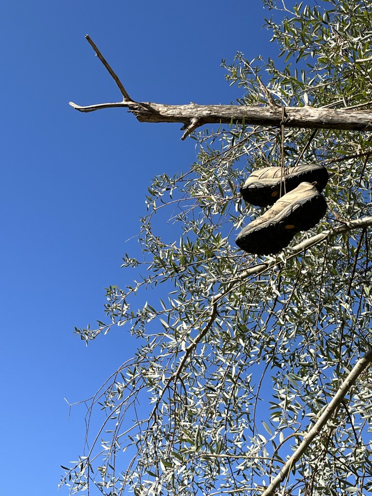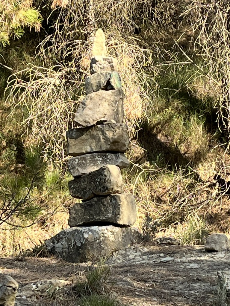 Along the path we came across an interesting place that I would call a rock cairn memorial site. Rocks had been stacked with names written on or near each. There was also a tree with tied ribbons.