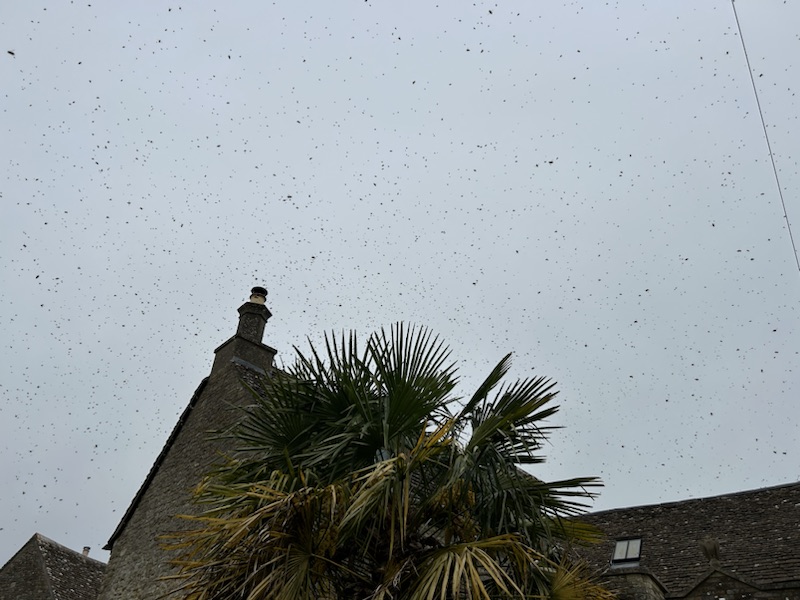 We heard a very loud buzzing sound, looked up, & saw a swarm of bees!!! A local woman told me she had called a bee keeper to come collect them.