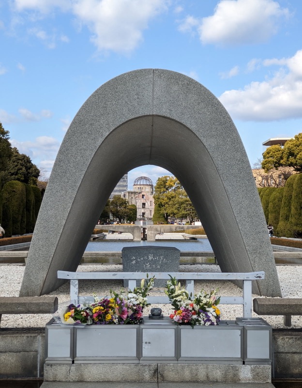 Between the Museum and the A-Bomb Dome is the Cenotaph for the A-Bomb Victims. The Cenotaph is an arched tomb for those who died due to the bomb, either from