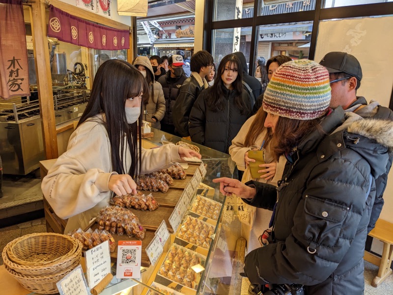 The first stop was at Nishomon Yodhinoya for sake tasting. There we sampled different kinds of rice wine & learned how different qualities were created based on how much of the rice husk was milled off to create the sake. We also enjoyed drinking Amazake which means “Sweet Sake”. It can also be made as an alcoholic drink. The Japanese have been making it since the 3rd Century & it is mentioned in “The Chronicles of Japan” which is Japan’s second oldest book.