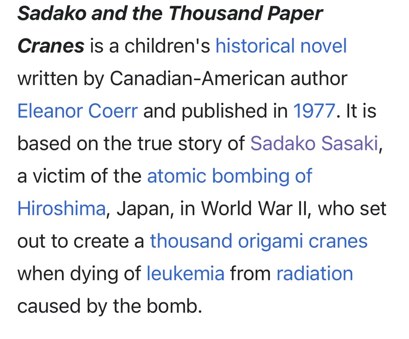 Her father told Sadako about a Japanese legend that the crane lives for a 1,000 years & it is said that if you fold a 1,000 cranes & put your heart into each one, then they will help you with your wish for wellness.