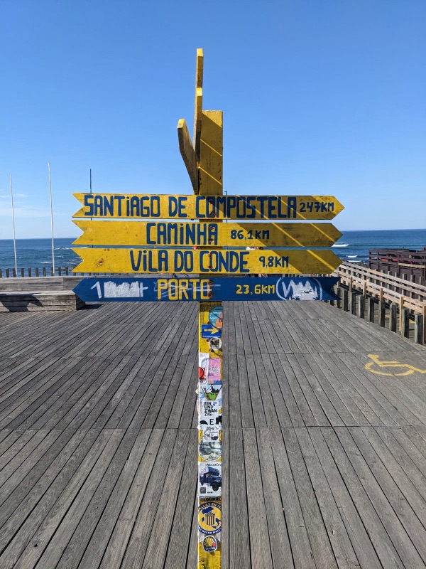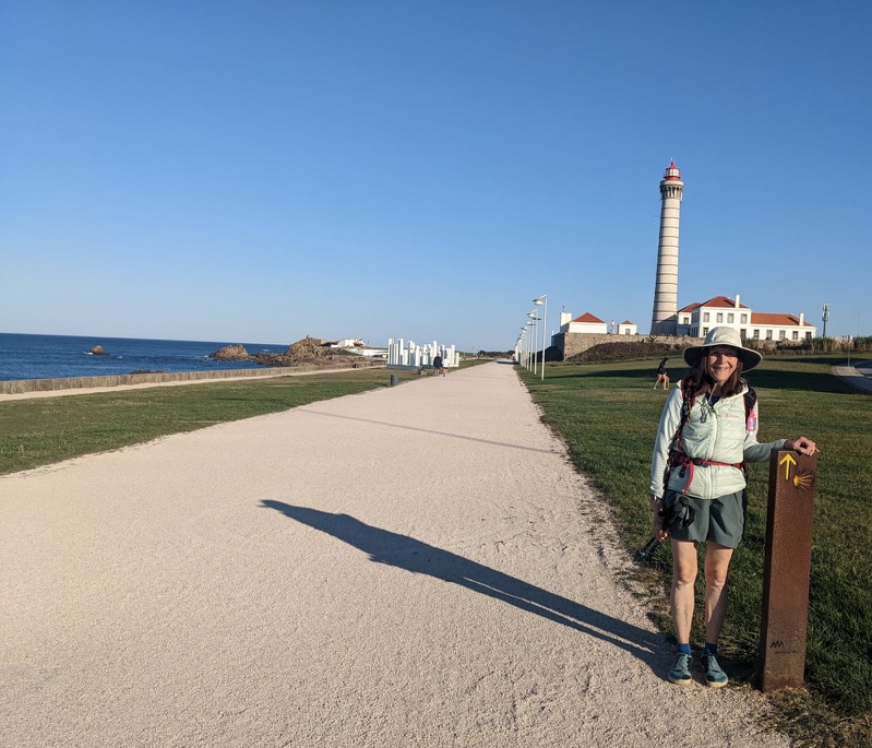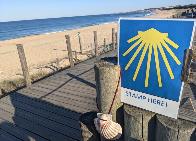 Getting started in MatosinhosNoa Nova Lighthouse- Portugal’s 2nd tallest lighthouse- 46 meters highBeautiful views all morning longPlace to get a stamp in your pilgrim passport bookLobster trapsOnly 247 km to goLong morning shadowsYellow arrows always show the wayStopped & bought a shell for my pack. The shell is the pilgrim’s traditional symbol & is worn by many people on their way to Santiago. The first shells worn by pilgrims came from this beach in Matosinhos.Relaxing??? I think not. On the Camino boardwalkJust like on the last Camino, always fun things to see on the wayHouse with humorous mosaics & tilesLong boardwalk through the sand dunesIgreja Matriz in Vila do Conde was built in 1518.