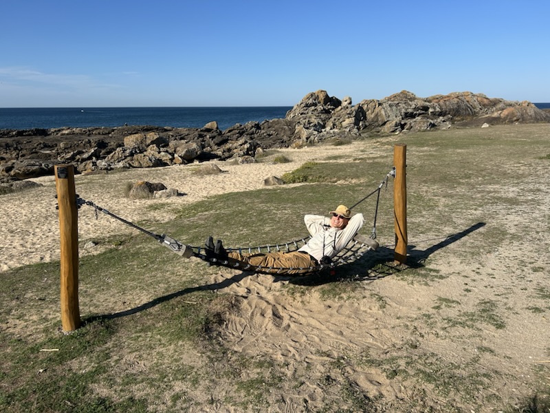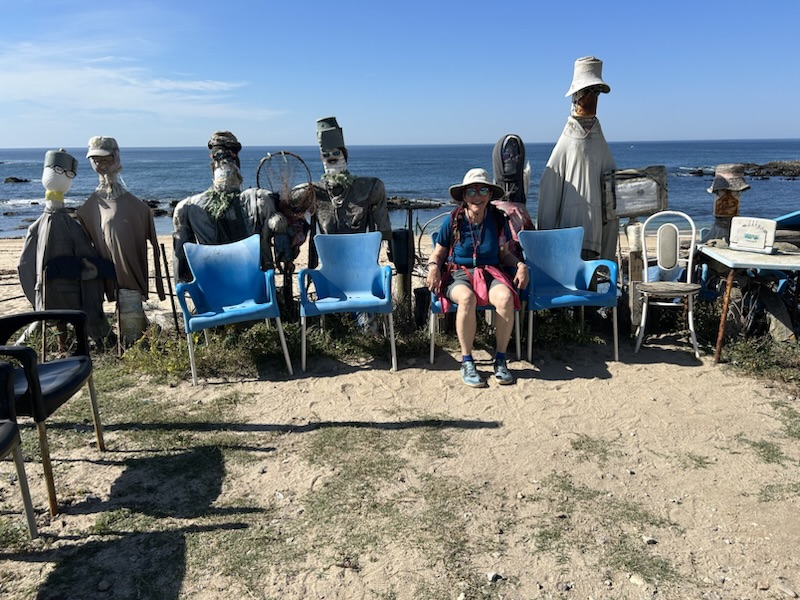 Ancora in the distance I learned from our last Camino that a cup of Cafe con leche gives me an extra boost around 10:30 AM. This shocks all my close friends who know I never drink coffee at home. My secret sauce for these long days. 😂A cold, wet “ Drive On” rag around the neck is my husband’s little secret. Saw this couch on the rocky beach that screamed “Kodak Moment!”