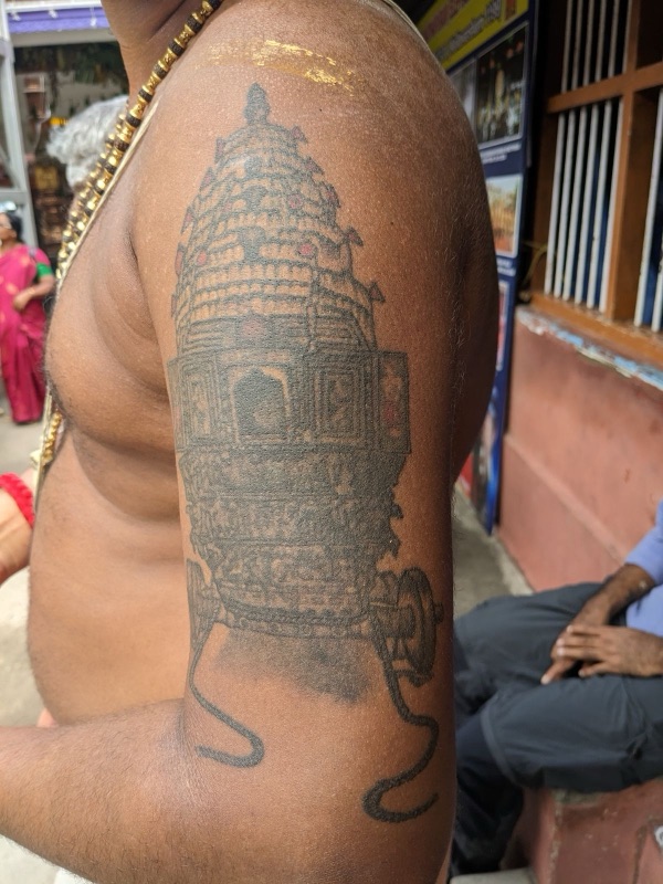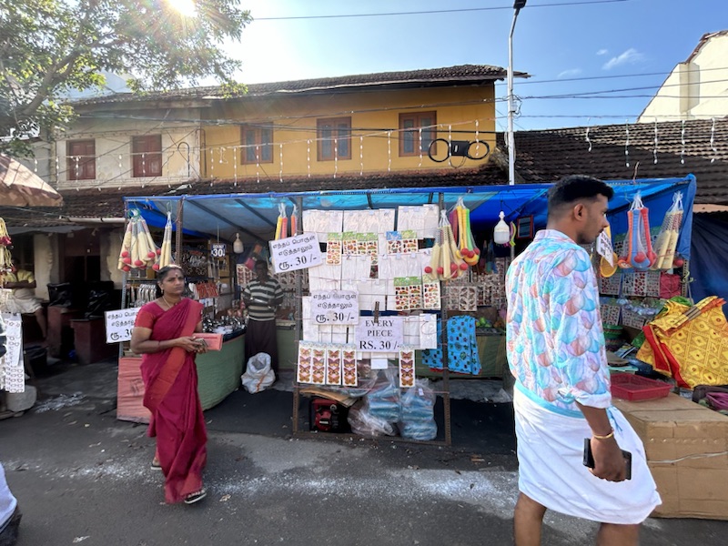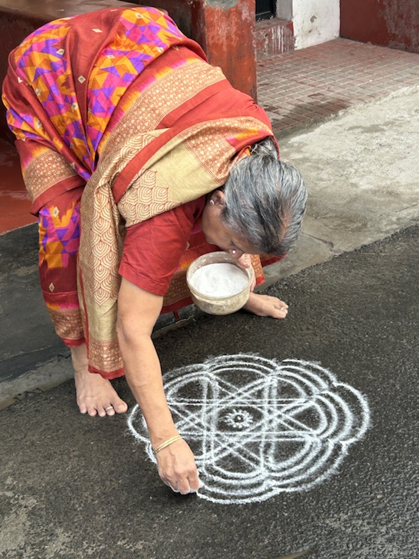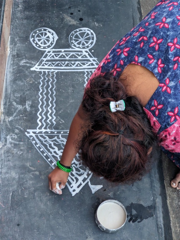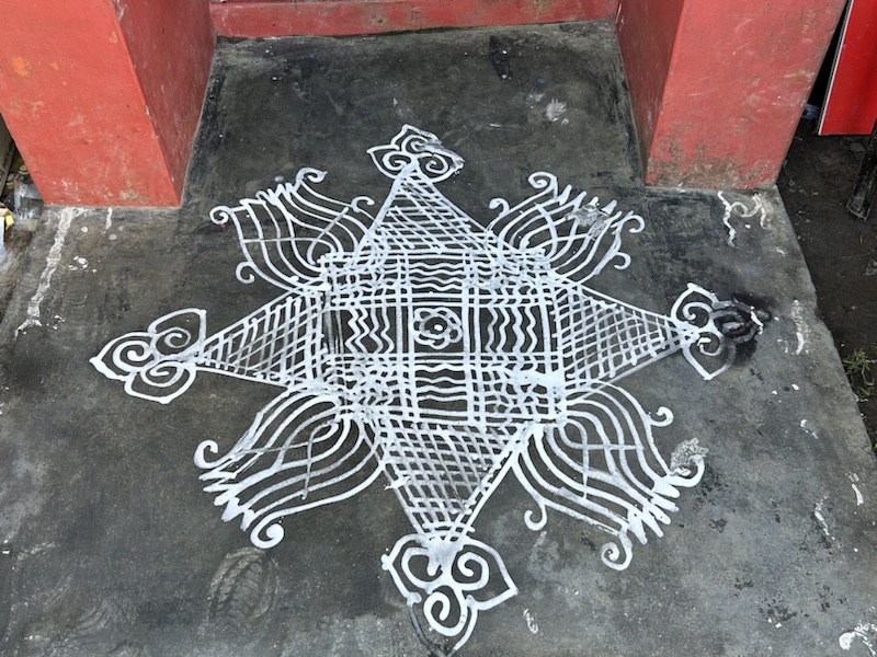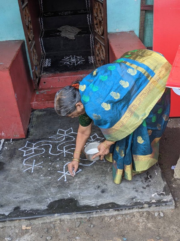 This woman is using the Maakkolam method. This woman is using the Arikkolam method This woman is using rice paste to make a design commemorating the chariots that will be pulled later in the day These designs are done to celebrate your home. I think it’s a lovely custom & a beautiful way to start the day.