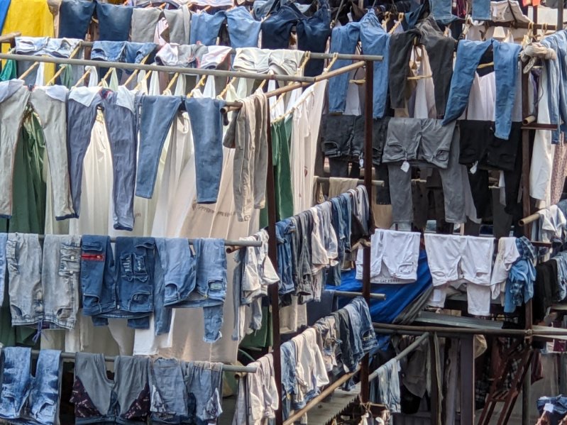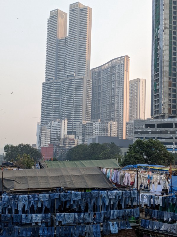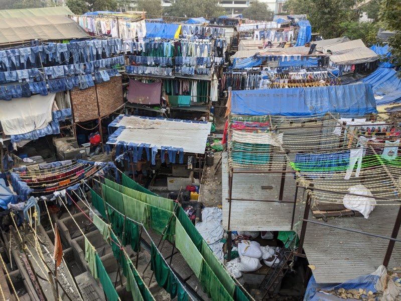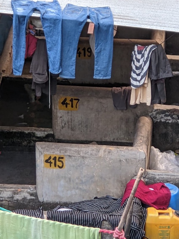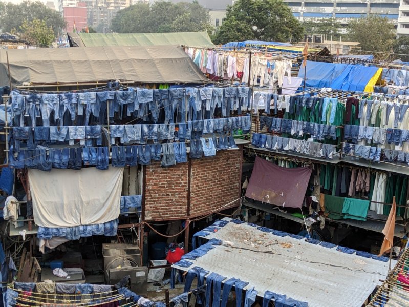 Next we saw the laundromat… Mumbai style. This area is Dhobi Ghat which means “a place where washer men clean clothes & dries them.” It is the world’s largest open air laundry. Clothes are collected in neighborhoods, then labeled by number by customer. The clothes are then washed, dried, ironed, & delivered back to the owner.