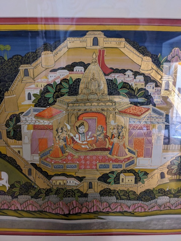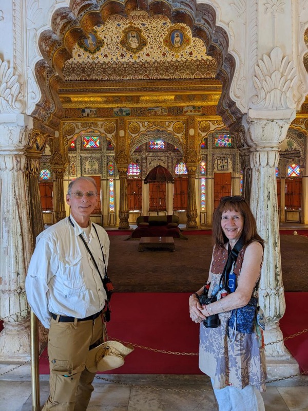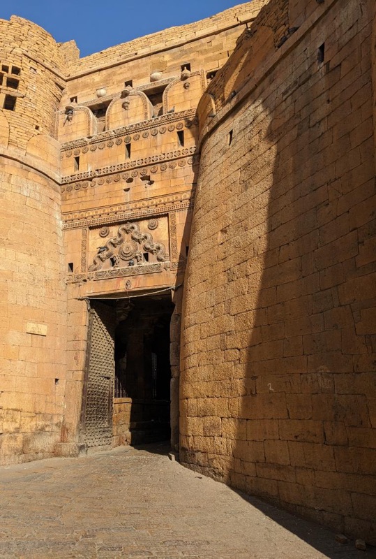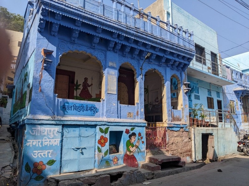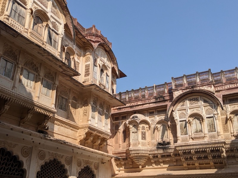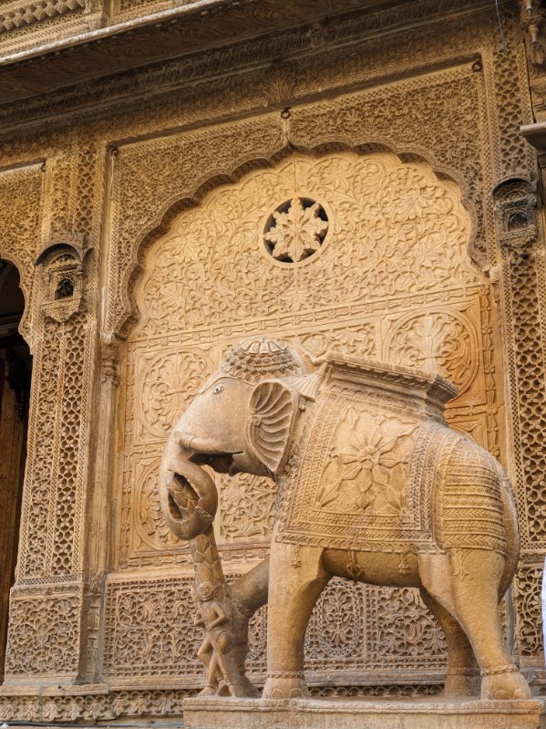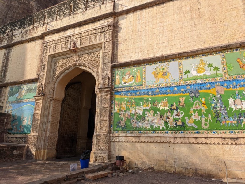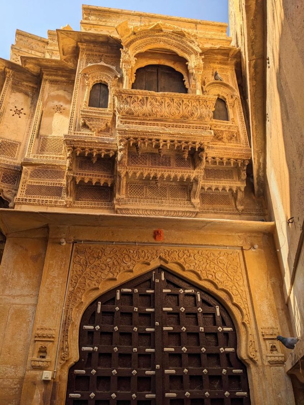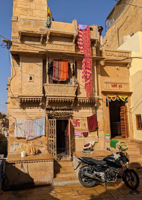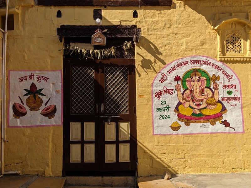 Original carvings & construction on the right; new construction on the leftRoyal quarters on the left; harem quarters on the rightJain TempleLook closely at the painting on the right. You will find a date (20), a month, & the year (2024). This sign showing Ganesh, Hindu God of Beginnings & Removing Obstacles, means someone in this home was married on that date. You see these signs all over the fort with the most well-worn ones dating back for decades. The painting remains in place until another person from that home is married & at time, a new sign is painted over the old one with the newer wedding date. Many homes in the city have a lime & chillies strung over their doorway as a good luck symbol.