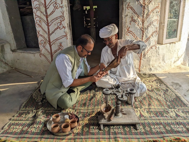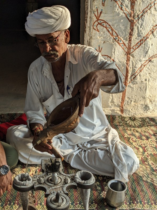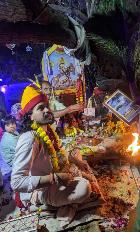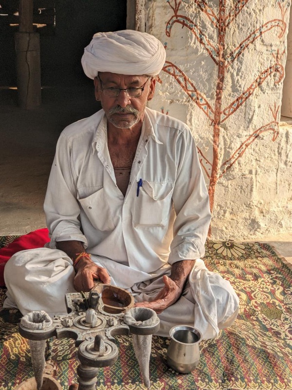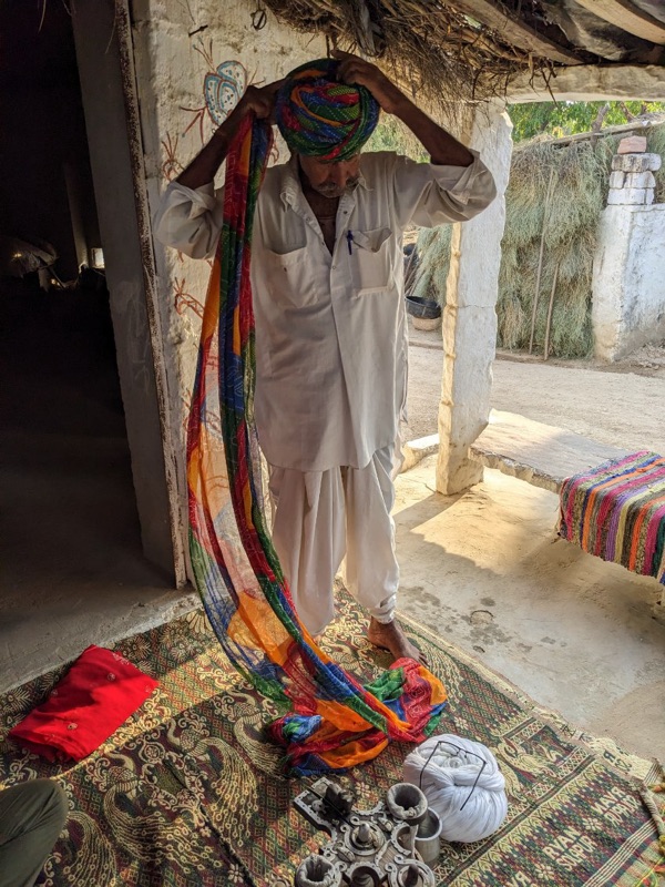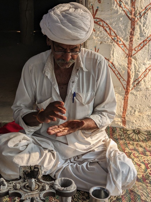 Our guide had a short conversation with the priest. He told us this group meets twice a month according to the moon’s phases. This group was meeting to commemorate a local Bisnoi hero from hundreds of years ago who was killed defending cows from being slaughtered by invaders. It is said although his head was cut off, his body continued fighting to protect the cows. The priest is known in the area for healing various sicknesses. There was also a man there around 80 years old who had the ability to speak with the dead.