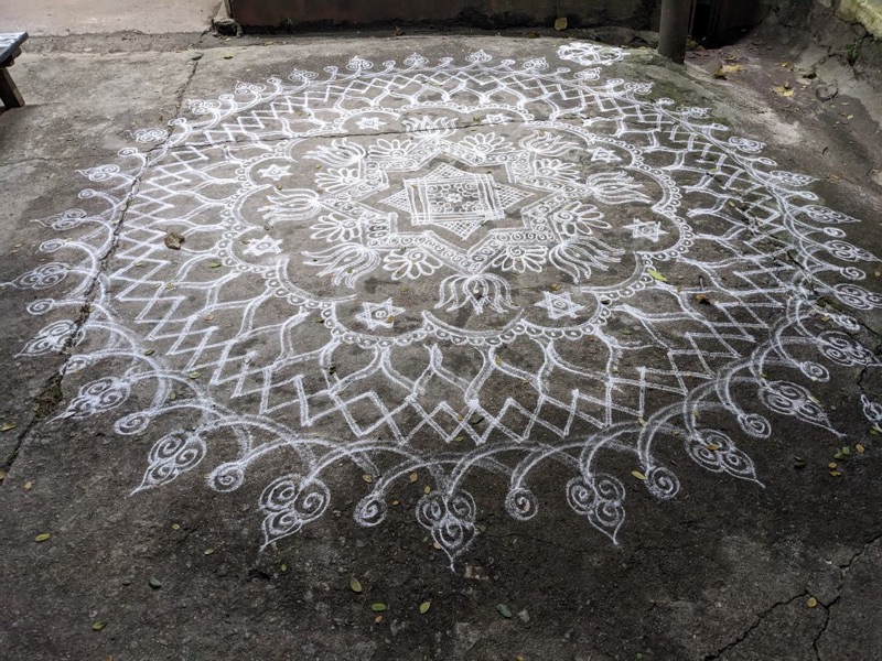 After the area dries, the woman of the house then makes her daily design using two methods- using dried rice flower is called Arikkolam, or using a liquid paste of rice & water called Maskkolam.