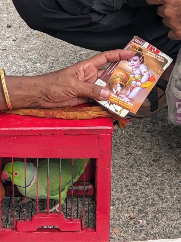 The festival also features unique fortune tellers. For less than a dollar, a tame parrot picks a card & the seer tells you about your strengths & weaknesses based upon the Hindu God picture on the card that the bird picks.