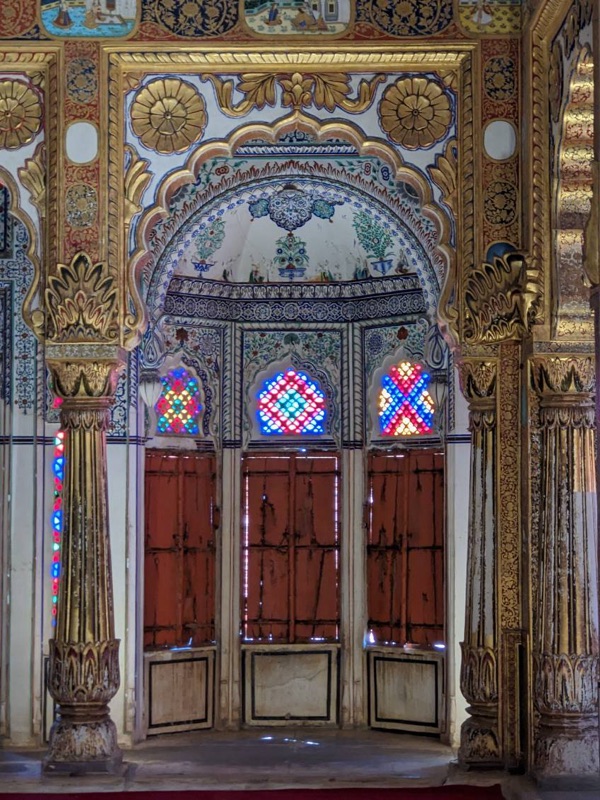 Sheesha Mahal- The Mirror Palace BedroomPhool Mahal- The Flower Palace (The stained glass was imported from Murano, Italy)The Flower PalaceMoti Mahal- The Pearl Palace This is where the Maharaja held court. It got its name because pearl dust from crushed pearls were used to finish the walls.Wives & harems had to be kept out of sight; but, they could view what was happening through these stone carved, lattice windows