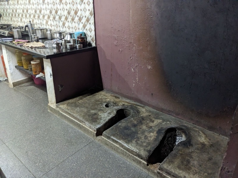 A kitchen with open fire pits for cooking. Some homes have stoves using bottled gas.Home shrine with man doing nightly prayers.