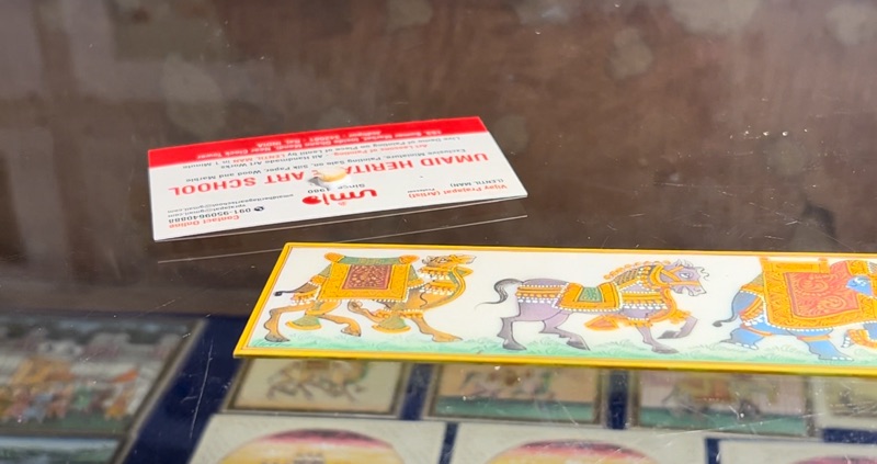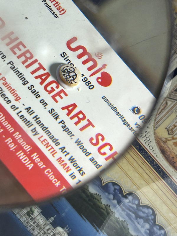 In the old city, we met the “Lentil Man”. He not only paints using the ancient art method used to make the above paintings displayed in the fort; but also, he is so skilled & talented, he can paint an elephant on a single lentil using that technique. He also teaches students this ancient art form which requires using a single hair from a squirrel’s tail to paint. He gladly demonstrates his expertise to tourists.